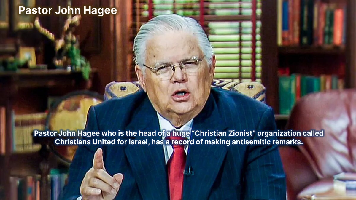 John Hagee, for instance, who is the head of a huge “Christian Zionist” organization called Christians United for Israel, has a record of making antisemitic remarks. According to journalist Jonathan Katz, Hagee has said that “Hitler was a ‘half-breed Jew,’ that the Antichrist is also ‘at least going to be partially Jewish’ (and gay), and that Hitler was sent by God for the purpose of driving the Jews to Israel — which, Hagee argues, is ‘the only home God ever intended for the Jews to have.’”