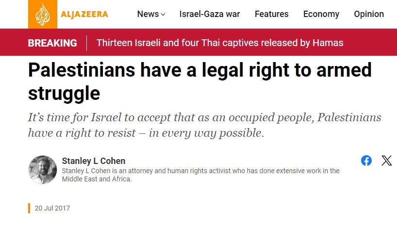Long ago, it was settled that resistance and even armed struggle against a colonial occupation force is not just recognised under international law but specifically endorsed.