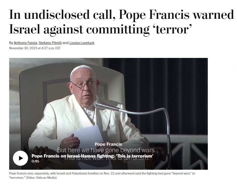 The Vatican declined to clarify whether the pope was publicly or privately describing Israeli actions in Gaza as “terrorism.” But in a statement to The Washington Post, it acknowledged a call between the pope and Herzog. “The phone call, like others in the same days, takes place in the context of the Holy Father’s efforts aimed at containing the gravity and scope of the conflict situation in the Holy Land,” the statement read.