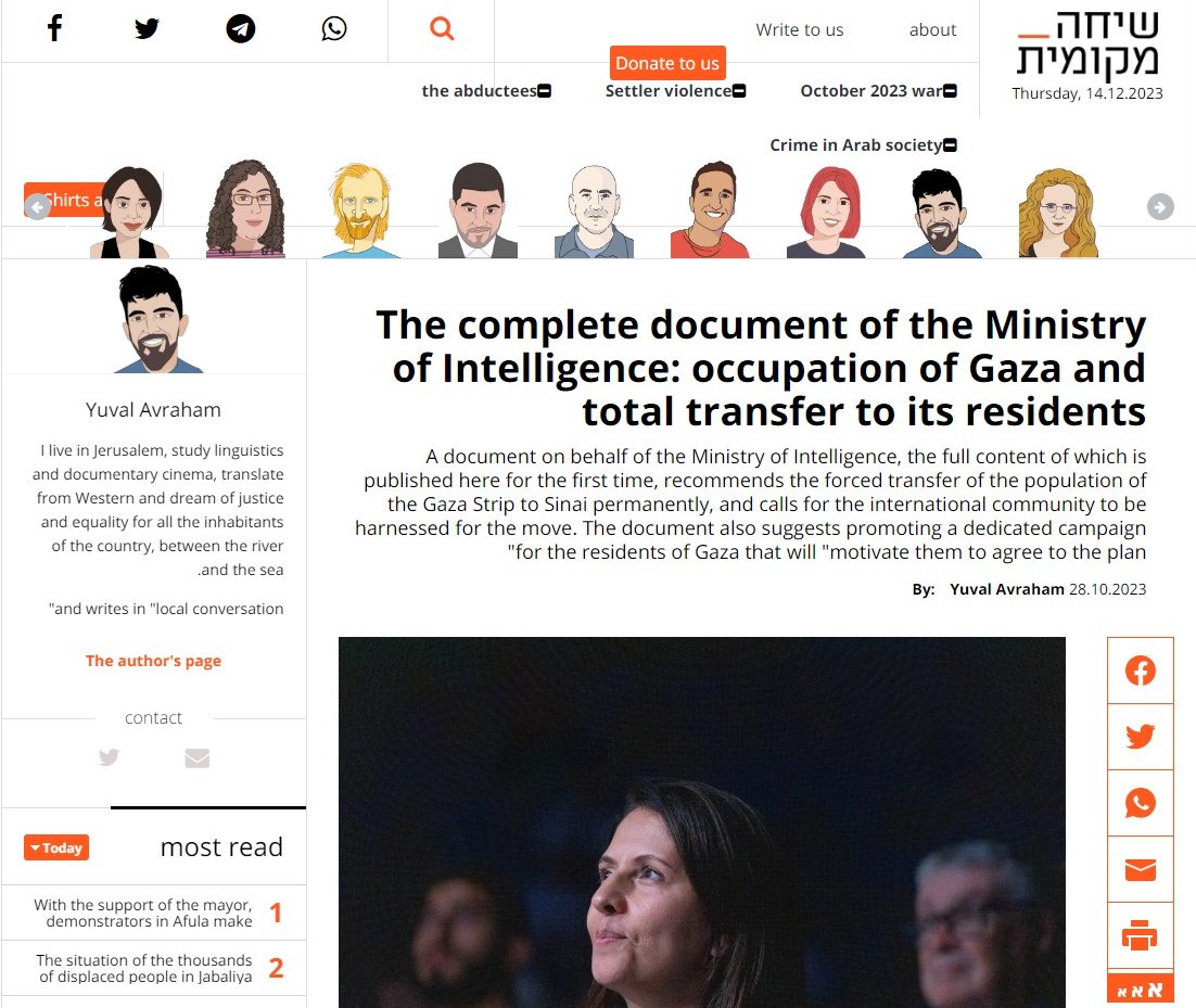 A document on behalf of the Ministry of Intelligence, the full content of which is published here for the first time, recommends the forced transfer of the population of the Gaza Strip to Sinai permanently, and calls for the international community to be harnessed for the move. The document also suggests promoting a dedicated campaign for the residents of Gaza that will “motivate them to agree to the plan”
