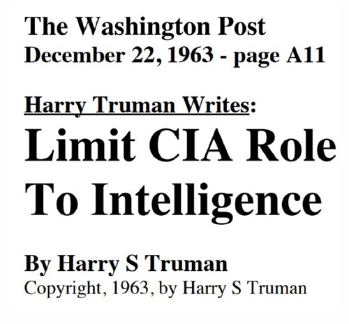 On November 22, 1963 President Kennedy was assassinated and 30 days later President Truman wrote an article that was published in the Washington Post detailing how Truman had intended the CIA to be an information gathering operation – not an autonomous “loose cannon.”