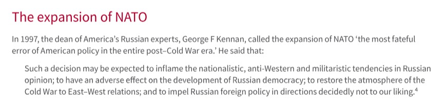 1. *George #Kennan, America’s foreign policy strategist*, the architect of the U.S. cold war strategy. As early as 1998 he warned that NATO expansion was a “tragic mistake” that ought to ultimately provoke a “bad reaction from Russia.”