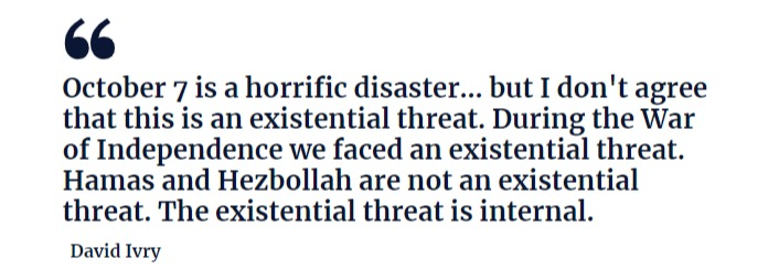 October 7 is a horrific disaster… but I don’t agree that this is an existential threat. During the War of Independence we faced an existential threat. Hamas and Hezbollah are not an existential threat. The existential threat is internal.David Ivry