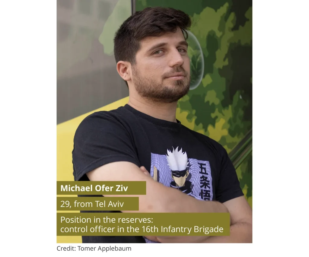 Michael Ofer Ziv, 29, from Tel Aviv, also signed the letter of refusal to do more reserve duty. During most of his compulsory service, he was a combat soldier in the Kfir Infantry Brigade. He served later as an operations officer in the 16th Brigade. In October, he interrupted a vacation in Turkey to report for duty. During the fighting, he was appointed the brigade control officer.